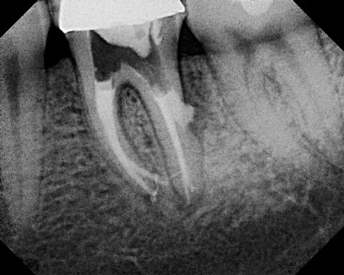 Cette petite perforation latérale doit être obturée au MTA sous peine de voir rapidement apparaître une infection osseuse(eugenol.com).
