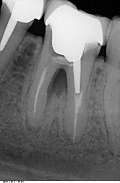 Perforation radiculaire mésiale obturée (EMS).