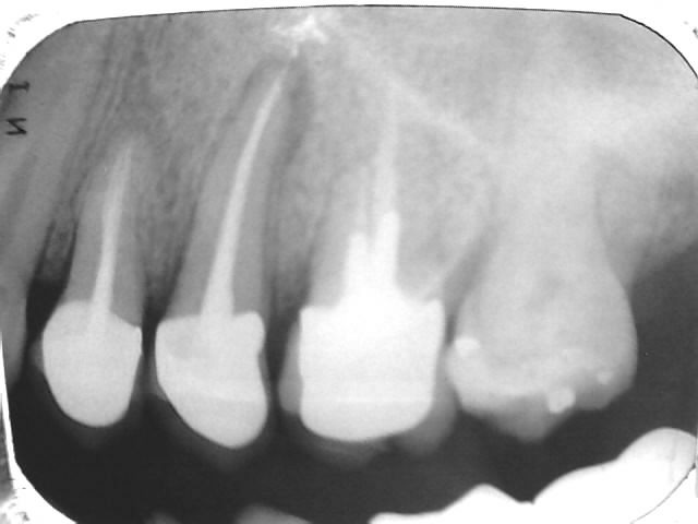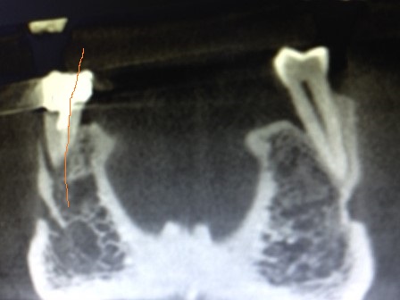 Scanner d’un 45 porteuse d’une dent à pivot qui a fêlé la racine.