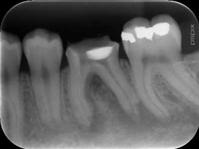 Cette dent dévitalisée depuis une vingtaine d’années semble avoir un problème de couronne (support infecté ou non étanche).