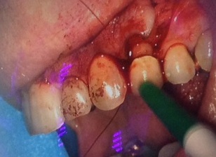 Un lambeau vestibulaire est ouvert et l’apex apparaît après nettoyage de la cavité osseuse.