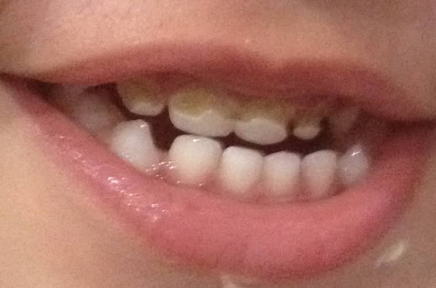 Ma fille a eu une hypominéralisation traumatique sur ces deux incisives centrales supérieures définitives suite à un traumatisme des dents temporaires. Ses incisives ont poussé avec deux grosses taches blanches mais notre dentiste nous a toujours conseillé de ne pas tenter de les enlever car l’émail de ses dents est très fragile.